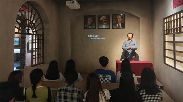 大家在讲解人员带领下,依次参观了展区“党内政治生活的艰难探索”“党内政治的初步定型”“党内政治生活的曲折发展”“党内政治生活的良性运作”部分,体验在延安窑洞里聆听毛泽东讲党课、在上饶集中营感受李子芳和叶挺感人肺腑的狱中对话、再现陈望道翻译《共产党宣言》场景,重温党在革命奋战时期的光辉历史,感受党内政治生活的历史脉动。