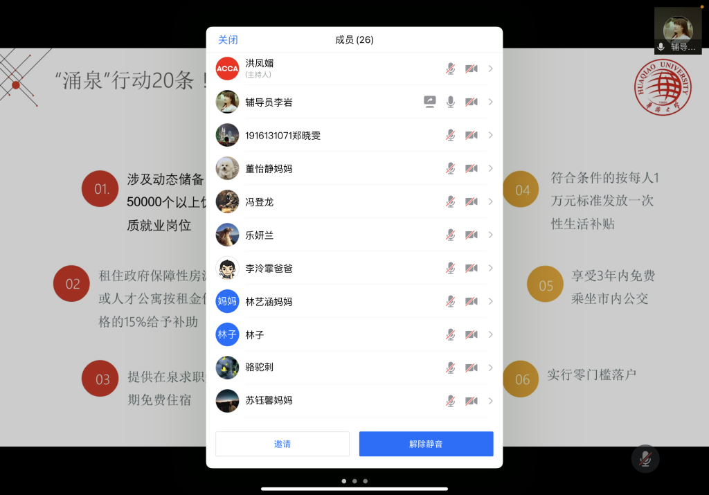 辅导员李岩向学生及家长介绍了“涌泉行动”人才政策的主要内容,详细讲解了“涌泉”行动20条政策“干货”、39项具体任务,帮助学生“知政策、懂政策、用政策”,鼓励有意愿留泉的同学们关注政策、用好政策,为人生第一份工作打好政策基础。
