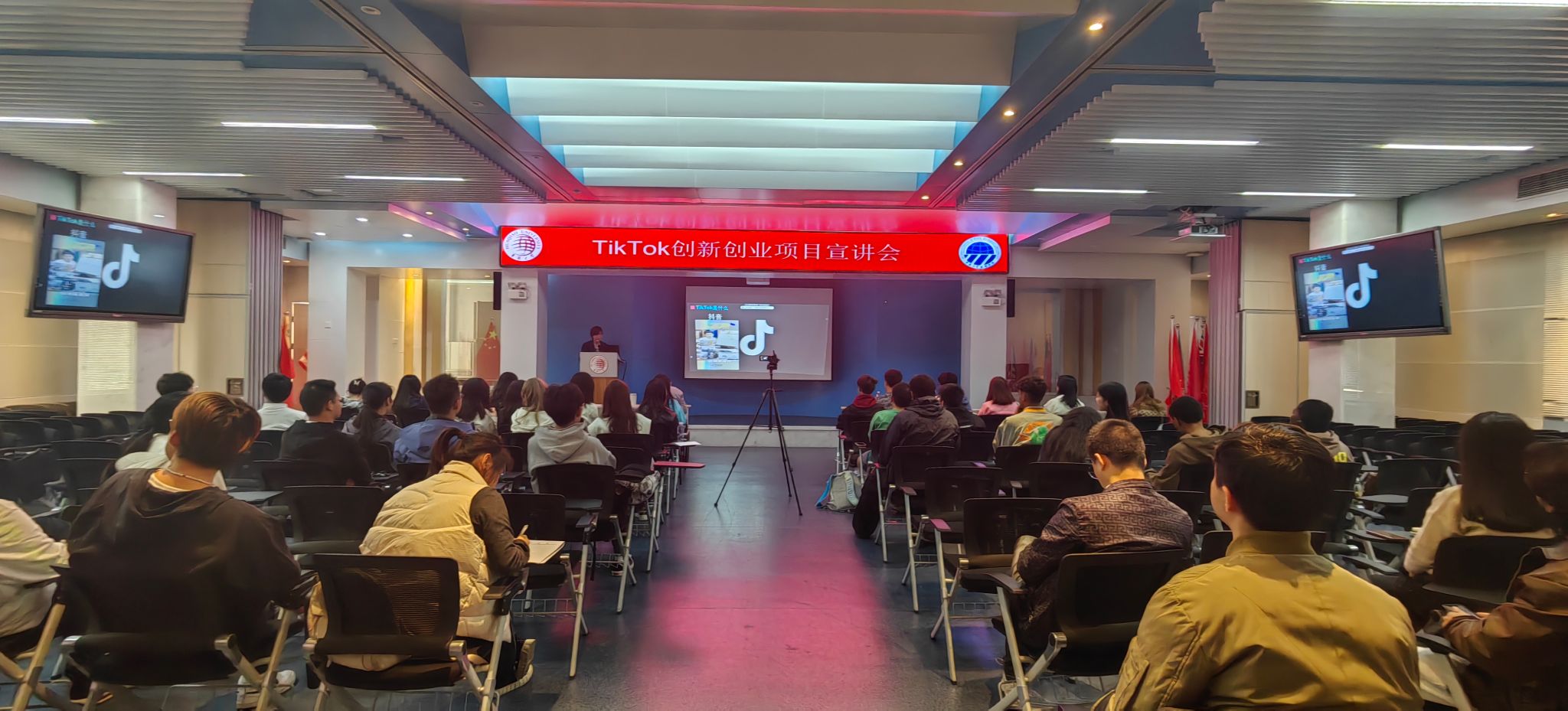Tik Tok创新创业项目团队主讲嘉宾针对当前的海内外TikTok市场环境进行了深入分析,认为国外网络直播市场发展潜力巨大,并介绍了一些国内成熟的运营策略以及在国际舞台上取得成功的案例,由此鼓励在校师生不断激发创新创业精神,充分发掘和培养自身的创新创业能力。此外,主讲嘉宾重点介绍TikTok的运营模式,特别是如何通过“一个主播配合一个运营”这一模式如何实现效益最大化。该创新创业项目为公益性质,前期已经搭建直播大棚,旨在降低在校师生学习与参与门槛,提供真实的实操实践环境。最后,在交流环节,同学们积极进行互动提问,Tik Tok创新创业项目团队针对同学们提出的问题耐心解答。