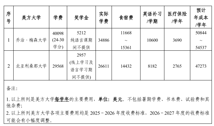 2.在美国学习期间的学费、住宿费等费用均按美方合作大学相关规定标准执行。美方合作大学为项目学生提供数额不等的奖学金,所获奖学金将直接从学费中减免。《中美人才培养计划》121双学位项目费用由学生自理,美方合作大学费用及奖学金情况如下: