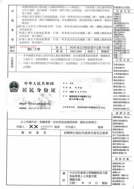 各校通用版.大陸地區人民入出臺灣申請書.pdf (若学校申请材料中没有要求则不必提供)