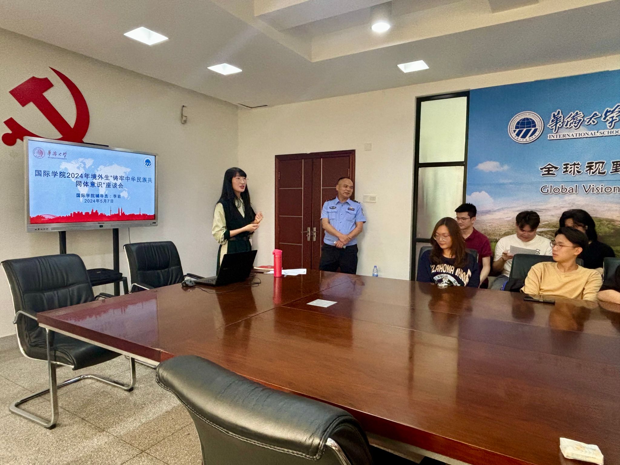 为增强境外生对自身和财产的安全意识,提高安全保障系数、普及强化“铸牢中华民族共同体意识”,加强院内各国家、各地区以及各民族的学生团结融合、建设校园诚信文化,进一步强化学生诚信意识、规则意识、纪律意识,yl9193永利集团于5月7日下午在杨思椿五楼会议室举行境外生座谈会。会议由辅导员李岩主持,华大派出所杨志斌警官做专题分享,yl9193永利集团全体境外生参与会议。