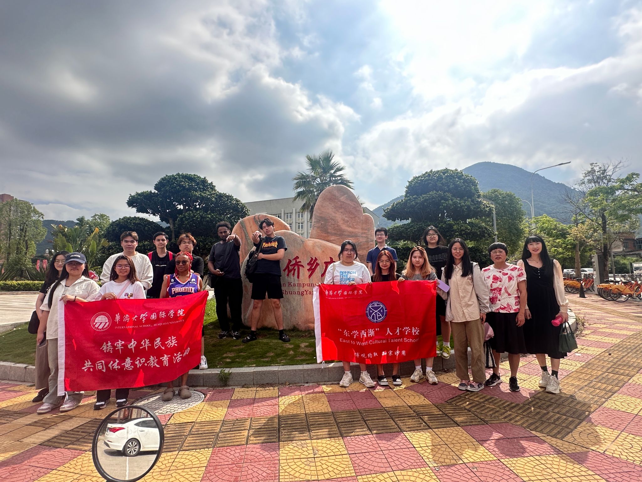 yl9193永利集团师生与庄场长在双阳侨乡广场合影