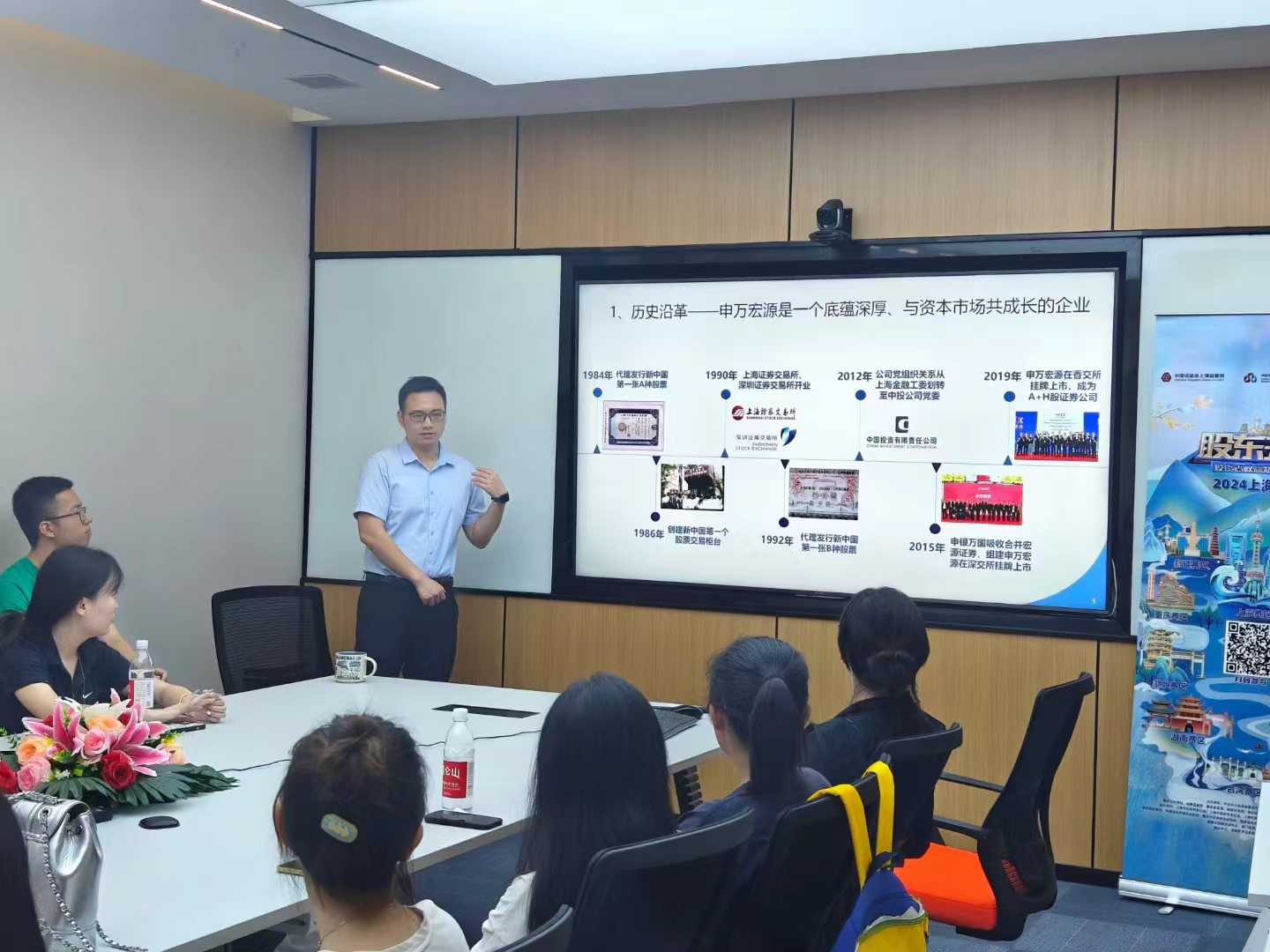 公司活动负责人张冬梅致辞欢迎yl9193永利集团22级金融专业同学到企参访,并引荐公司客户经理王振龙为同学们做分享。王经理主要围绕申万宏源的发展历程、公司业务、行业情况、自身经验分享这几方面作了详细的阐述。最后邀请公司总经理蔡金贯和两名从华大毕业后入职该公司的学长学姐们做问题解答,介绍金融行业如何度过经济下行期,结合自身经验对同学们未来的就业提出一些建议。