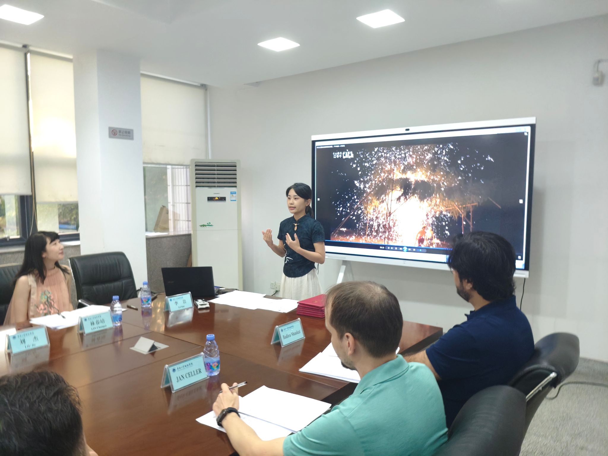柳晶晶老师首先做“Iron Sparkling:illuminating Chinese Culture”的演讲,介绍打铁花这一国家级非遗,其以工匠抛铁水造流星般火花展现惊人技艺与不屈精神,传承着中华民族的勇气与毅力。