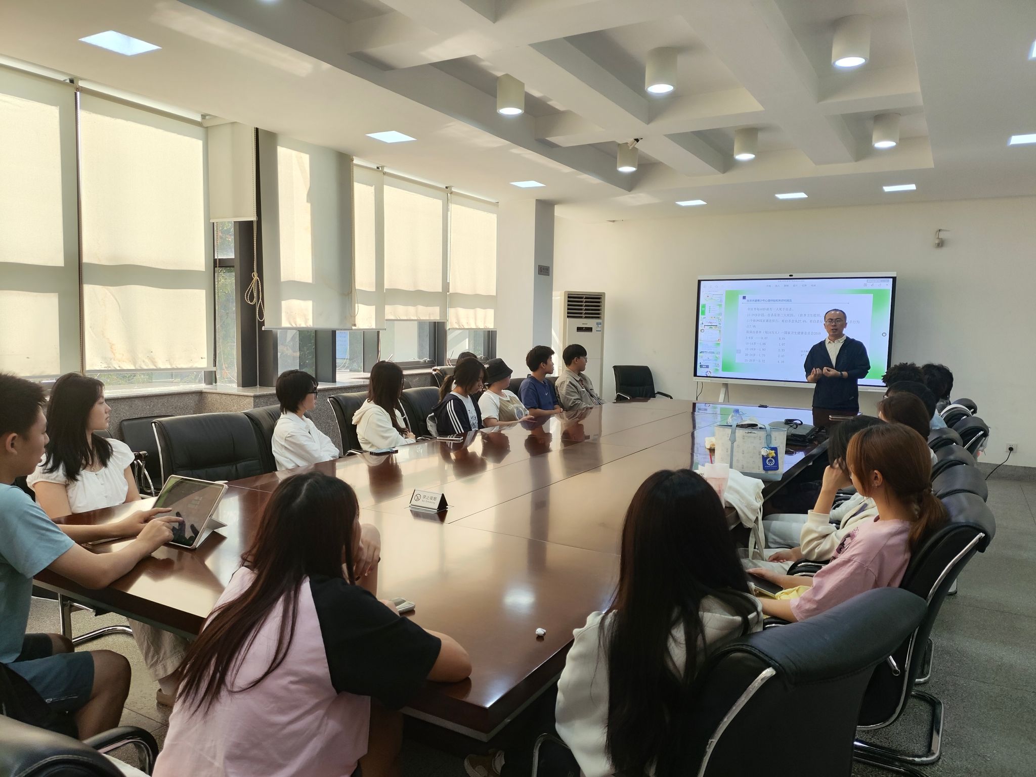 韩旭以《做有担当的生命“守门员”》为主题详细讲解了如何准确识别和有效帮助身边有自杀倾向的人,为心理保健员们提供实践指导。韩旭认为,心理保健员作为生命守门员,具有沟通效果好、信息来源广、心理距离近以及自我成长快等四大优势,肩负着收集信息、及时上报以及协助心理康复工作等重要职责,是学院心理健康工作中不可或缺的力量。希望全体同学能够学会识别心理危机预警信号,推动寻求帮助、理解危机个体并及时报告反馈,用实际行动热爱与守护生命。