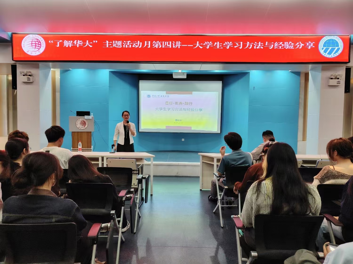 本次讲座内容主要围绕目标·素养·践行展开。讲座伊始,瞿皎姣带着全体新生由远及近,在纸上写出十年、八年直至近三个月、一个月的目标,并结合“SMART”法则引导新生做好目标设定;制定目标后,瞿皎姣以自己博士后导师的经历为例,告知新生不仅要制定学习目标,同样要学会坚持。随后,在个人素养锤炼方面,瞿皎姣强调作为国际全英商科专业学生,要注重培养自己的认知能力,尤其是培养商学思维、管理学思维与企业家精神;在数智化的浪潮中,建议新生做好社会资本、心理资本、知识资本等智能资本的累积,以适应时代变化。讲座最后,瞿姣皎以管理学大师彼得·德鲁克的箴言——管理学不在于知,而在于行结尾,强调在学习的过程中一定要做到知行合一,贵在践行。