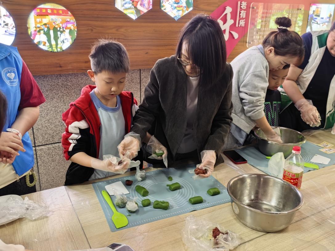 活动现场,志愿者向社区居民讲述清明节的历史由来与踏青、祭扫等传统习俗,结合时令特点开展健康膳食科普,并引入居民最期待的亲子青团手作环节,志愿者们指导和协助十余组家庭揉面、包馅、塑形,欢声笑语间,一个个青翠欲滴的青团陆续成型,民俗温情浸润社区每个角落。