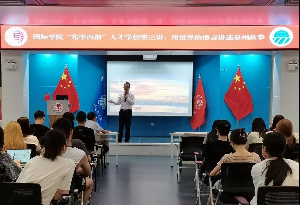 王强副教授在讲座之初引入了文化软实力的概念,用出色的口才与渊博的知识,生动形象地传达了文化的力量。文化扎根于人们的生活中,传自口中,听在耳畔,感受于心间。在讲解中,他列举了几个常用的日语表达来简单说明其与闽南语之间的渊源,说明汉语、汉字在日语的诞生和成长过程当中起到的重要作用。中国的一方文明竟深远地影响着其它国家,实在令人深受震撼,难能不生出自信之心。泉州作为海上丝绸之路的重要起点,不仅是商品集散地,还是宋元时期中国与海外政治、文化交往的一个中转站,是重要的港口与世界商埠,见证了古代海上贸易繁荣。