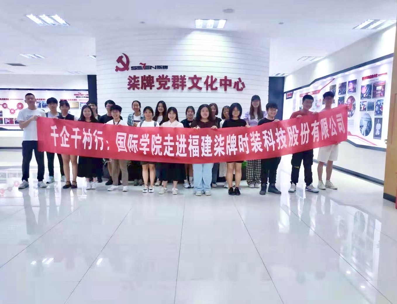 最后,同学们走进了企业的文化墙、专利墙以及党群文化中心。在“以人为本,诚信为本”经营理念的指导中,在企业党组织的指引下,柒牌把产品质量和公司形象置之首位。同时,企业纲领的“三五七一”文化,即“三让”“五为”“七文化”,也很好地诠释了柒牌的企业愿景。国际商务协会负责人李想同学表示,本次组织的企业走访让我们走出学校的“舒适圈”,真正走进企业内部进行参观学习,我认为这样的活动对于以后的就业求职有很大帮助。