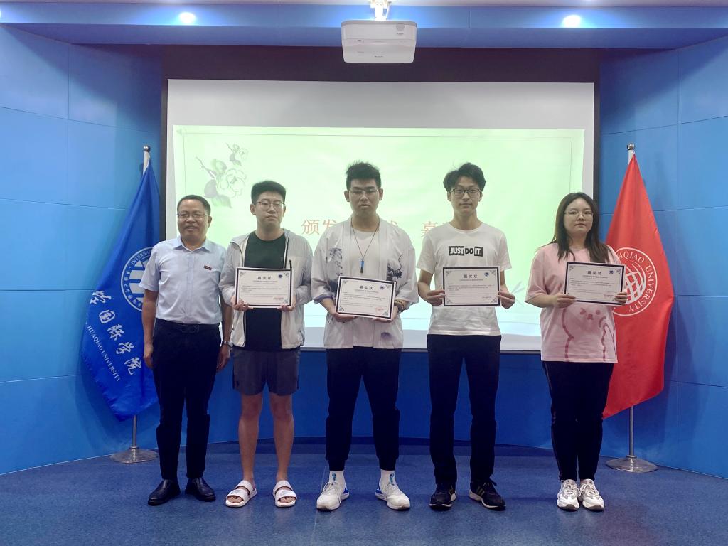 侯志表院长宣读表彰决定,表彰了在第十五届“挑战杯”福建省大学生课外学术科技作品竞赛决赛中获得特等奖、二等奖,以及在2021全国高校商业精英挑战赛国际贸易竞赛中获得一等奖的团队。