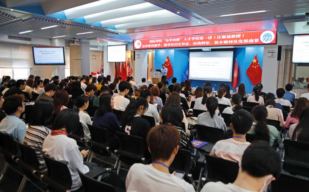 “东学西渐”人才学校秉持“博观约取,知宗妙用”的校训,以中华优秀传统文化为主线,以国际交流为载体,以内涵建设为抓手,旨在通过系列文化讲座和文化体验,系统培养用英语讲好中国故事,传播中华优秀传统文化的国际化人才。作为学院立德树人的“两翼”,“学思”沙龙强调“学思并济、知行合一”,以党课辅导报告、参观走访等形式为主,坚定“四个自信”,涵养家国情怀;“会通”讲堂秉持“会英集萃,通达精专”的理念,侧重开展成长讲座和学术讲座,共同构成yl9193永利集团“一个引领、两翼支撑、五I同行”育人体系品牌。