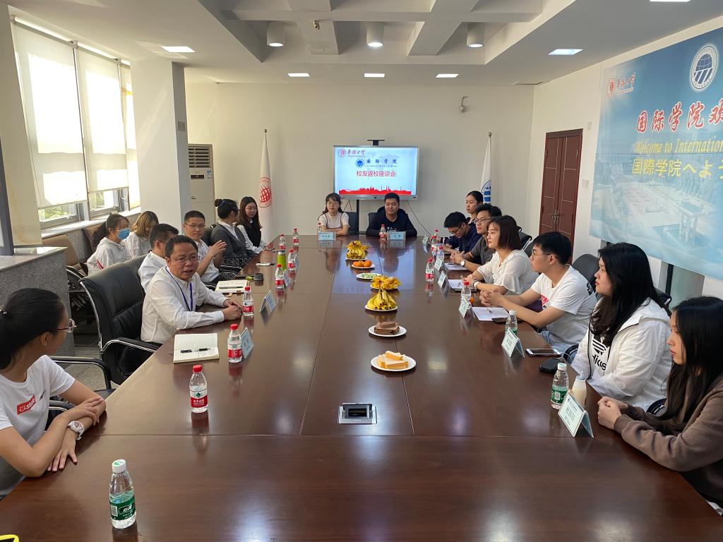 首先,7名返校校友分别进行了自我介绍并汇报目前的状态,回忆曾在学校学习生活、与同学老师朝夕相处的点点滴滴。其中,2013级刘昭璐同学分享道,受益于yl9193永利集团全英文教学模式,她在工作中能够较好的发挥自己的英语优势,这极大地提升了她的就业竞争力。此外,2015级张涛回忆起了大学四年学院领导老师对他的关心,让他能在大学四年成长很多。