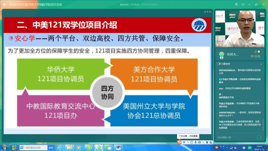 yl9193永利集团李勇泉院长亲自担纲主播,以“选择中美121双学位项目,敲开世界前100大学之门”为题,在新东方云教室平台上直播带“货”,向2020年高考考生及其家长全面介绍了中美121双学位班精品招生项目,从“优而学”“省费学”“安心学”“学有成”等角度重点详细介绍了我校品牌学生交流项目——《中美人才培养计划》121双学位项目。该项目由(中美双平台、两高校)四方共管、安全有保障,可拥有中美双学位、双边同学资源、中美社会体验,学费仅全程在美学习的50%,易于名校继续深造和跨国企业任职等显著成效,深受学生和家长好评。