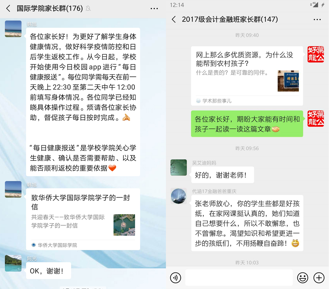 为解决在线学习学生端口可能出现的偏差,学院辅导员、班主任积极进行家校联系,沟通在线学习经验和困难,推动家长配合监督。为达到实效,学院建立了以年级、班主任为单位的家长沟通群,通过集中发布消息和单独交流的不同形式,使家校教育形成合力,确保每个学生不掉队,学有所获,为开学后的课堂教学和学习打下基础。
