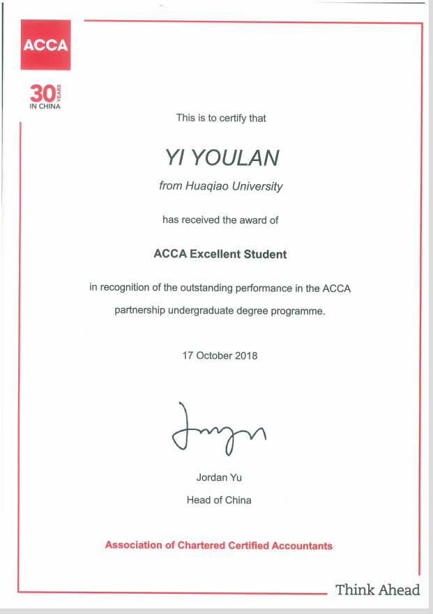 ACCA官方协会在颁奖词中表示:易有兰同学为永利集团首次评定授予的优秀学员,激励更多学生努力学习,取得更优异的成绩!同时也发出致谢:感谢yl9193永利集团为国际化人才培养做出的贡献!