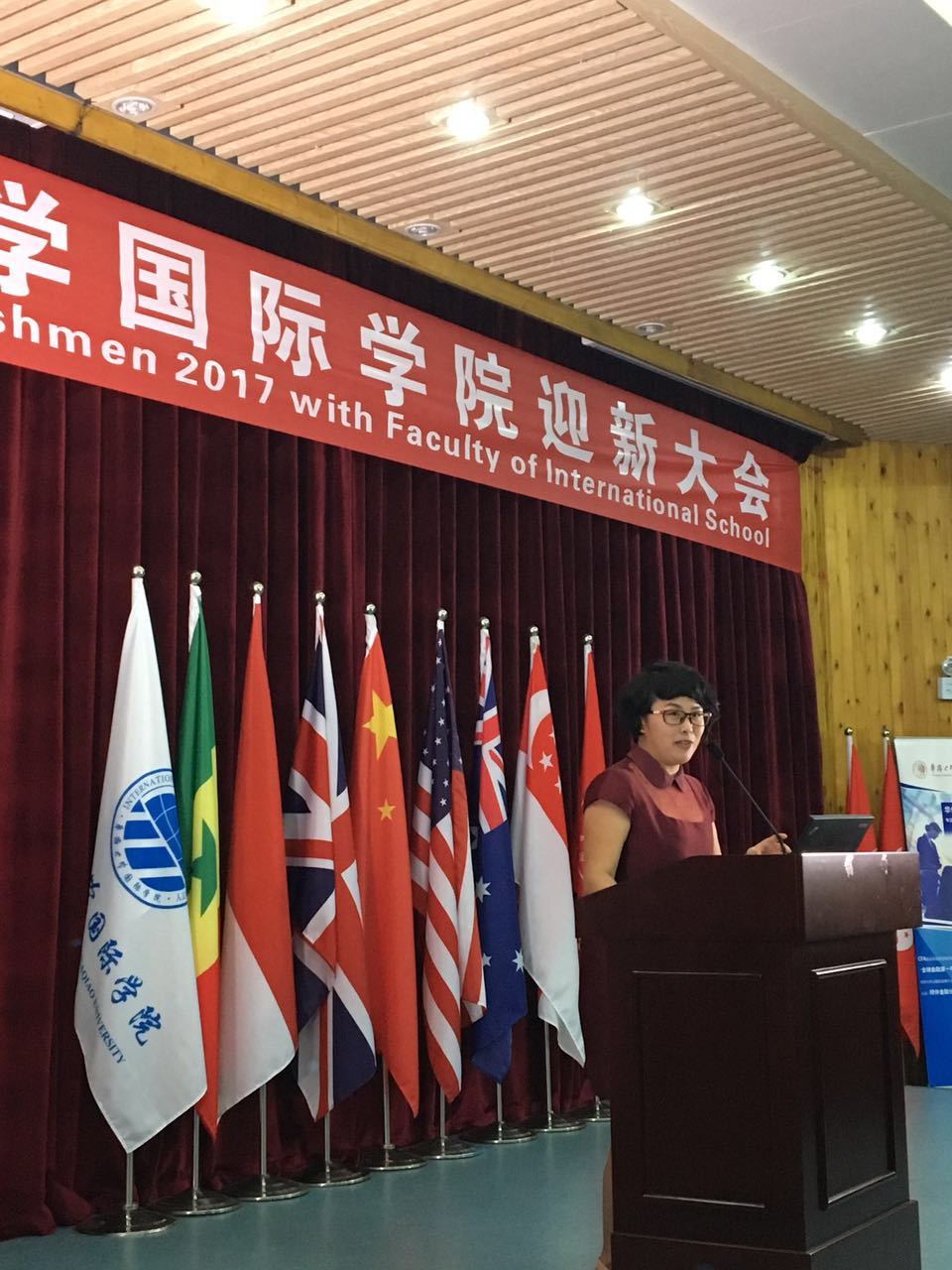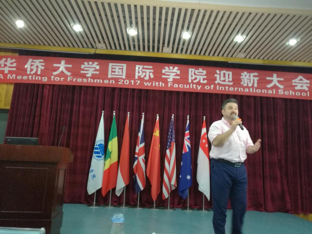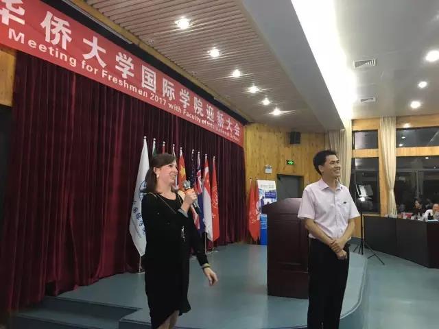 随后,教师代表王娜博士发表英文演讲,她首先祝贺同学们加入温馨的国际大家庭,能在这里度过人生中最重要的四年时光。在国际交流日益密切、国际贸易如此频繁的时代,当今大学生需要具有坚实的知识基础和国际交流的技能,理所应当接轨国际、最具国际范的yl9193永利集团是大家最憧憬期待的地方,这里有最具国际化的教学体系,这里有最具精英范的教师团队,这里承载着许多家庭的期盼,这里是梦想启程的yl9193永利集团。最后她想同学们提了两点建议,一是严于律己,完善自身,希望同学们能在四年的学习之旅中取得骄人的成绩。二是发掘潜能,挑战自我,提升自我的竞争力和坚持成长。