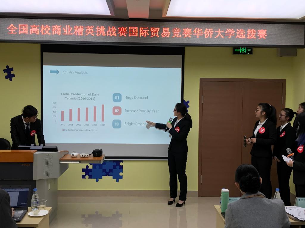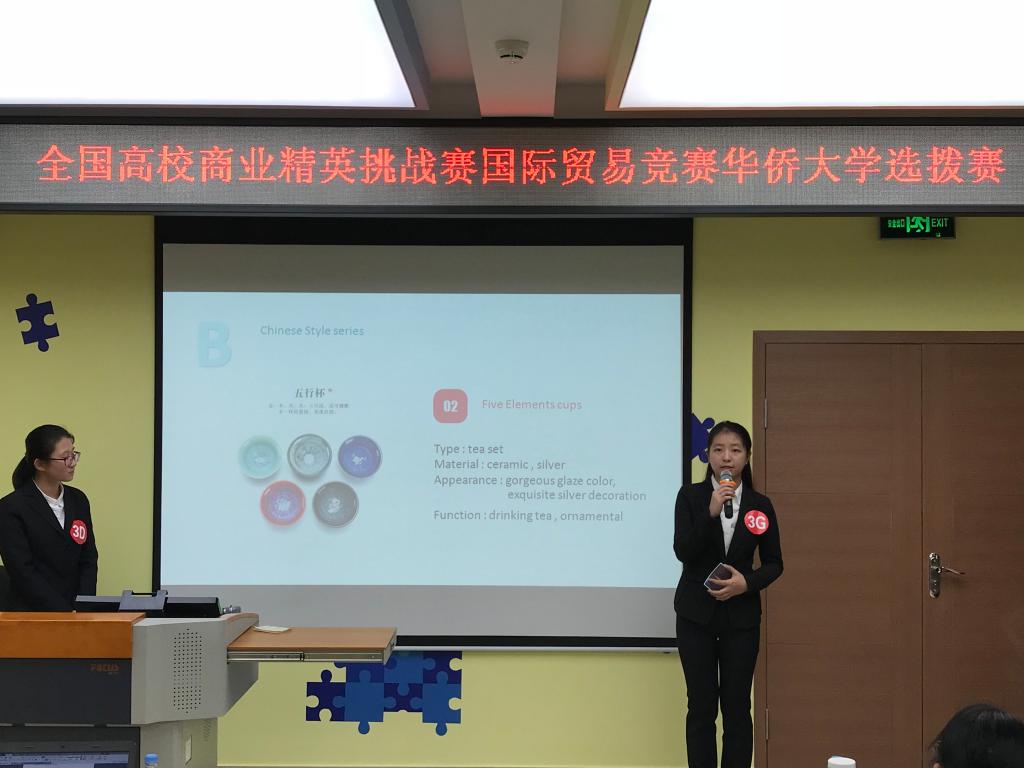 来自yl9193永利集团的36名选手组织五支队伍参加此次比赛,竞赛语言为英语。各团队选手以企业(模拟出口商)名义,分别从经费预算、人员分工、产品分析、营销方案等方面展示模拟企业产品的参展方案。经过激烈的现场展示与陈述,共评出2支决赛队伍。决赛团队将于2018年5月赴宁波国际会展中心参加全国总决赛,总决赛以“2018年中国(宁波)跨国采购模拟洽谈会”的形式举行,yl9193永利集团将邀请专业教师辅导入围总决赛队伍。此次系我校第二次组队参加。