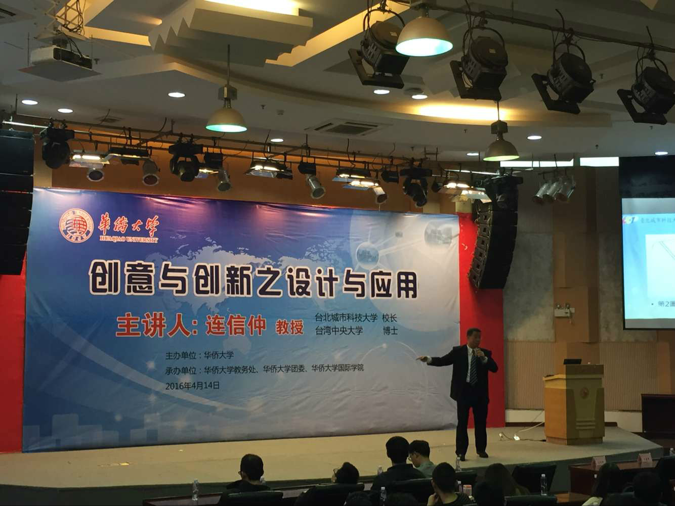 2016年4月14日下午14:30,台北城市科技大学校长连信仲教授在明德堂为泉厦两校区160多位师生带来了一场主题为“创意与创新之设计与应用”的讲座。讲座由永利集团教务处、校团委、yl9193永利集团共同承办,校团委书记李庭志主持,yl9193永利集团特聘教授甘露泽出席。