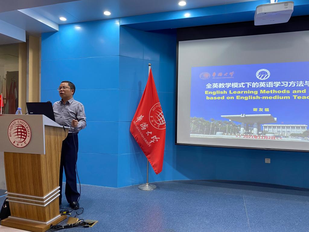 会上,谢友福书记根据自身英语学习经历与多年英语教学经验,讲授了在全英文模式下的英语学习方法与技巧。内容主要分为三个部分:一、英语的五大技能与训练方法;二、语言兴趣和学习习惯的培养;三、全英教学模式的英语学习策略。