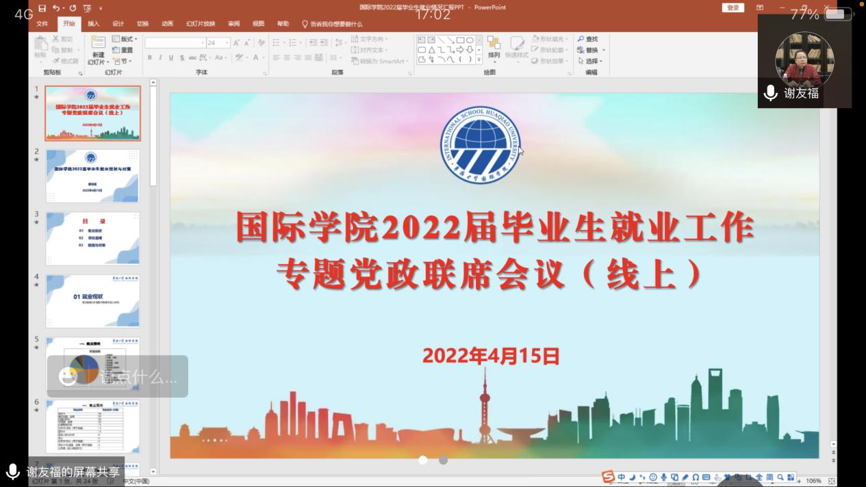 会上,学院党委书记谢友福介绍了学院2022届毕业生就业情况。受疫情影响,今年毕业生就业工作面临严峻挑战。截至2022年4月12日统计,2022届整体毕业去向落实率为32.46%,就业形势呈现整体就业比例偏低、出国出境比例较高、国内考研升学人数增多等特点。针对毕业生就业面临的严峻形势,学院采取了“服务+咨询+指导”举措,即通过就业政策服务信息推送、落实“一生一档一策”等精准做好就业服务工作,与优质留学机构合作引进公益留学咨询,为考研考公同学提供相关指导。