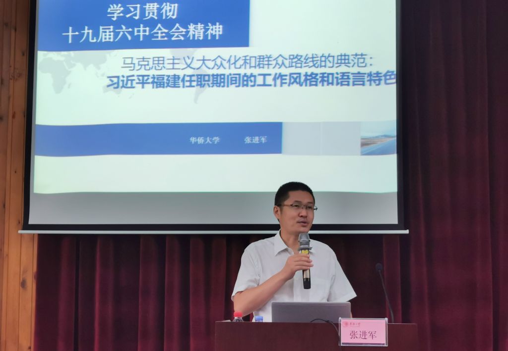 校党委讲师团成员、福建省高校特色新型智库“永利集团港澳台青年研究中心”研究员、马克思主义学院张进军博士,围绕学习贯彻党的十九届六中全会精神主题,作《马克思主义大众化和群众路线的典范:习近平福建任职期间的工作风格和语言特色》专题报告。他结合大量图文资料,介绍了习近平同志的履历、福建情结,以及统战工作风格、脱贫工作风格、生态文明工作风格、语言风格等。