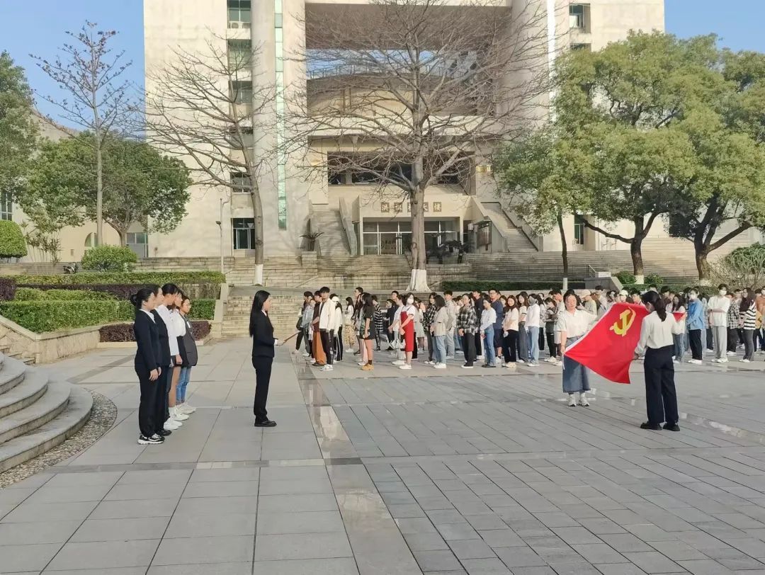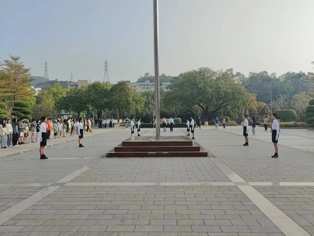 2023年4月17日,yl9193永利集团在廖承志广场组织“纪念廖公恩情 传承承志精神”主题升国旗仪式。yl9193永利集团学工办主任兼团委书记韩旭、辅导员李岩、陈仕航、2022级、2021级和2020级全体同学参加升国旗仪式。