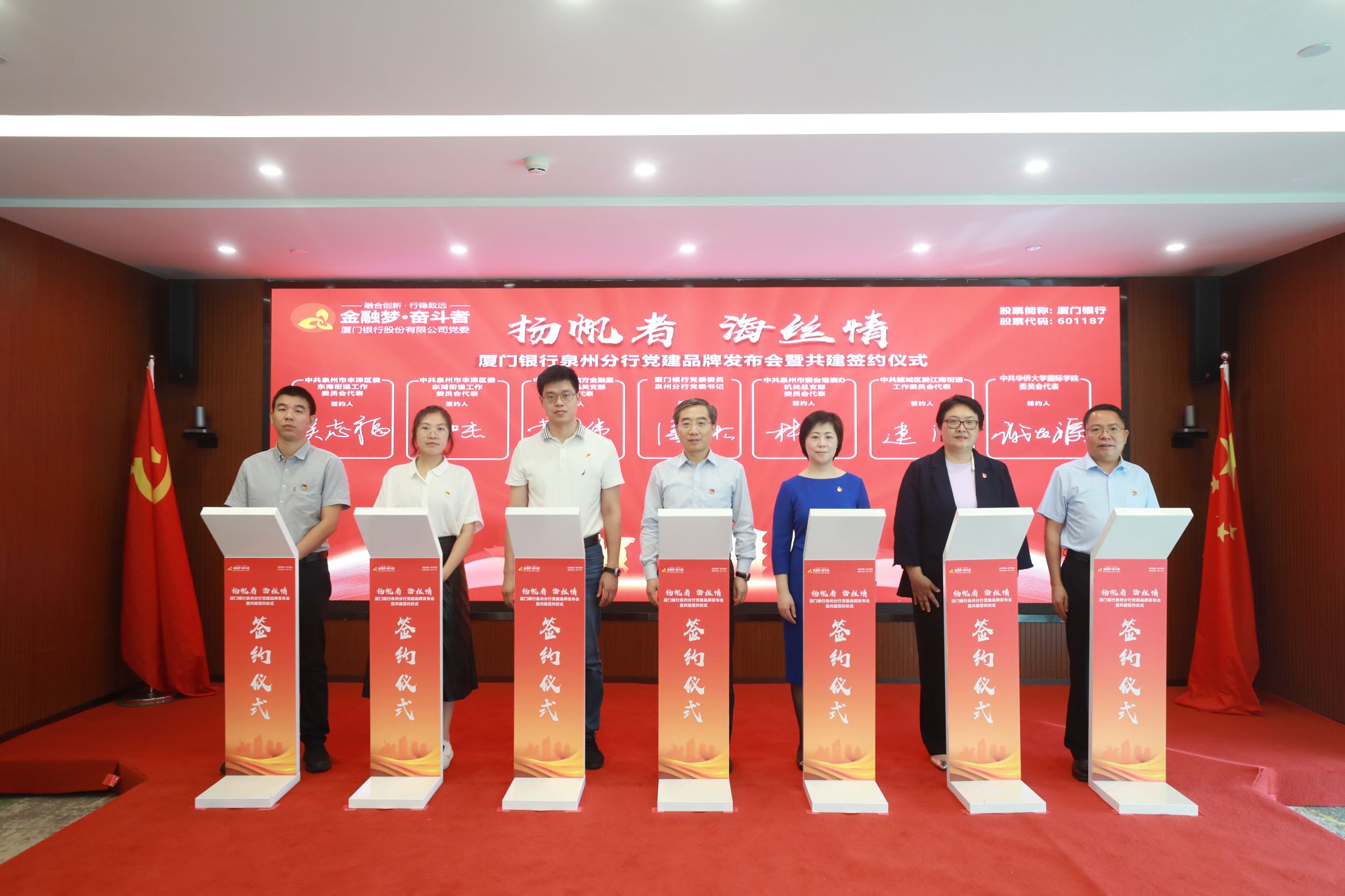 厦门银行党委副书记、监事长张永欢,厦门银行党委委员、泉州分行党委书记潘青松共同为分行党建品牌揭幕。仪式上,厦门银行泉州分行党委与包括yl9193永利集团党委在内的16家单位进行共建签约。仪式最后,厦门银行党委副书记、监事长张永欢致辞,对泉州分行党建品牌发布会暨共建签约仪式的圆满举行表示祝贺。