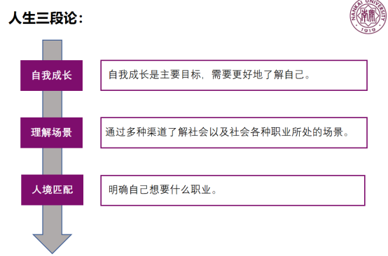 吴金兴博士结合自己的求学和从业经历,从人生三段论、热门与冷门和理性选择逻辑三个方面分享了自己的人生思考和规划过程。吴金兴博士认为,人生的求索过程是一个知行合一不断迭代的过程,亲朋和父辈可以提供很多的信息和意见,帮助我们了解自己、认识自己,并逐渐找到匹配自身的职业选择。