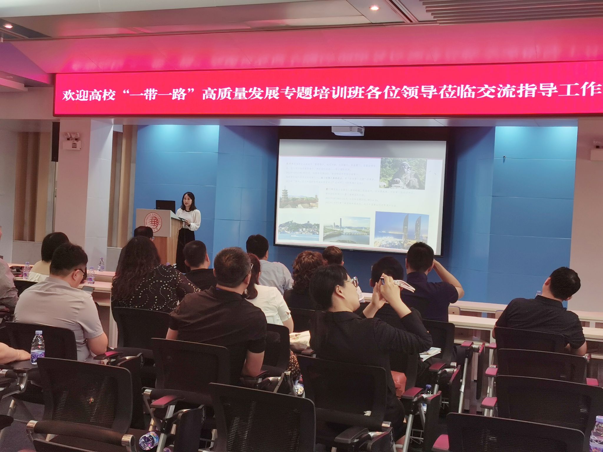 4月29日下午,高校“一带一路”高质量发展专题培训班各高校代表一行近50人来我院访问交流,了解国际交流合作情况及“一带一路”国际化人才培养成果经验等。我院院长侯志阳、兼职副院长苏梽芳,国际交流合作处副科长邹冰心在杨思椿科学馆五层多功能厅与来访客人交流。
