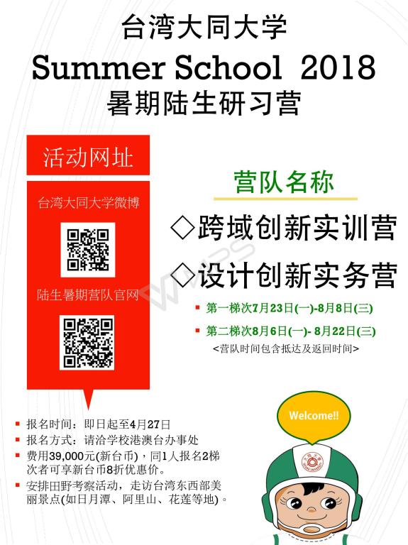 应台湾大同大学、世新大学等学校的邀请,我校拟于2018年暑假期间选派学生参加台湾高校暑期研学项目。项目详情请下载附件查看。