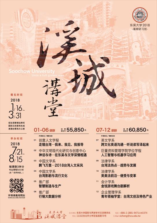 为加强海峡两岸高等教育交流与合作,增进两岸学子间的沟通与了解,东吴大学自2013 年起开办「溪城讲堂」暑期研习班。冀藉由本校各院系深具教学特色的品牌课程,提供大陆优秀青年学子利用暑期来校研习课程,并参加旅游及参访。本项活动宗旨在于提供多元学习平台,让所有报名参加的大陆同学在获得专业知识的同时,更有充裕时间深入了解台湾的风土民情。