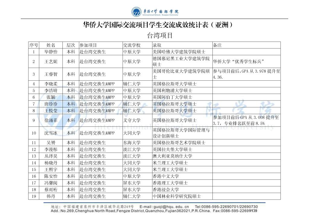 据不完全统计,参加项目的学生毕业后有相当大比例选择继续深造,其中参加过台湾项目的不少同学被世界名校录取,不少研究生在境外交流期间研究取得进展,发表论文。