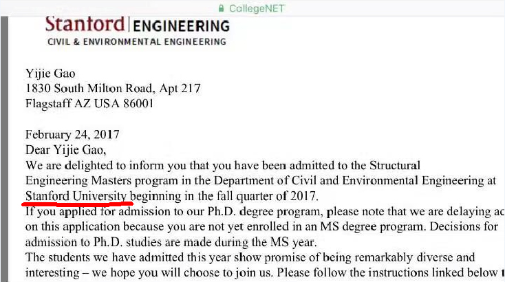 我校高怡洁同学收到斯坦福大学录取通知书截图