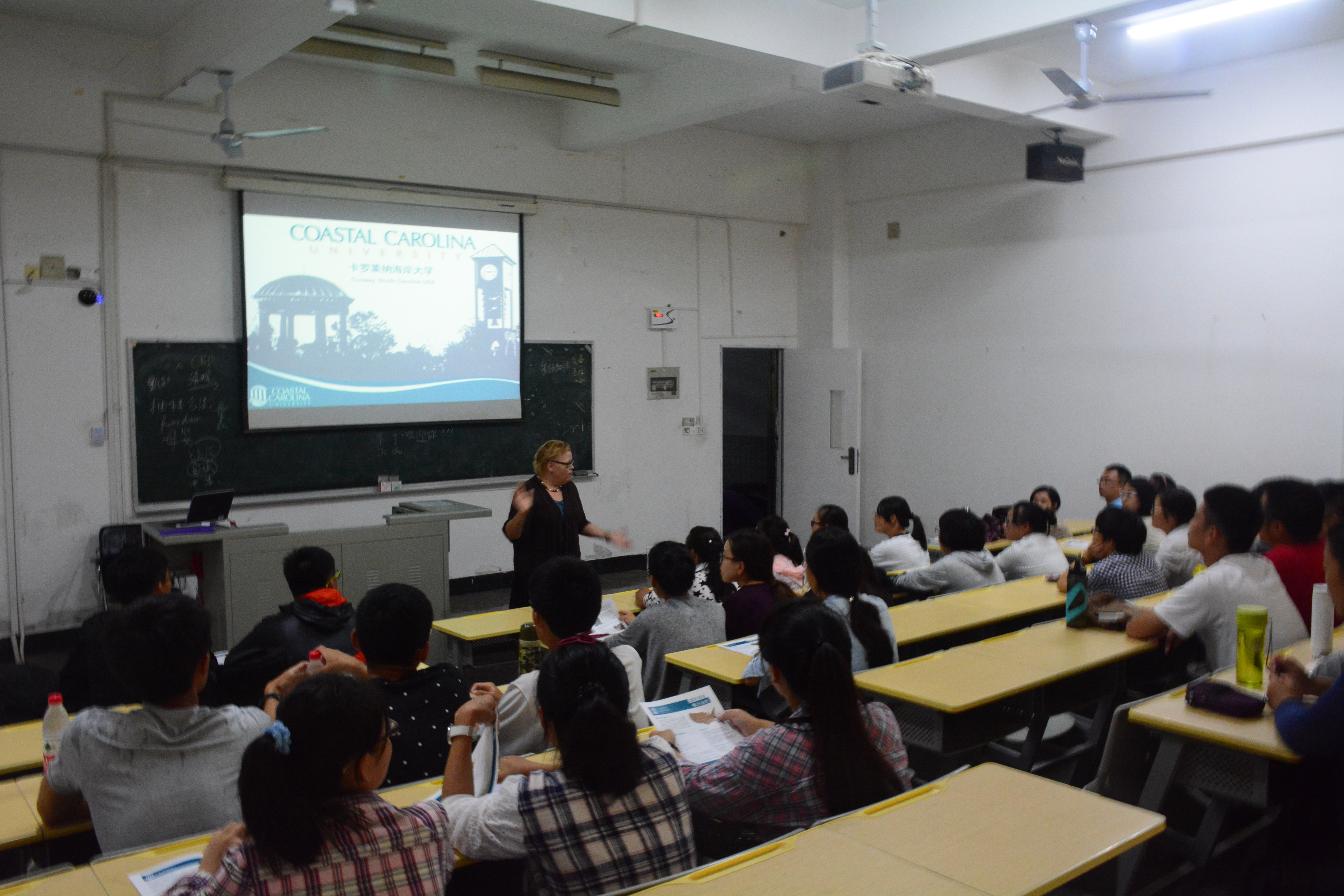 讲座伊始,Darla博士围绕卡罗莱纳海岸大学(CCU)的本科专业、基础设施、学习氛围、学生活动等方面展开介绍。她不仅与大家分享了永利集团2013级学生叶梓在CCU的留学心声,还结合自身经历,强调留学是一份宝贵难忘的经历,可以帮助大家接触更多元的世界,拥有更广阔的视野,促进个人全面发展。在问答互动环节,Darla J.Damonte博士详细回答了同学们了关于“宿舍环境”、“优势学科”等问题。