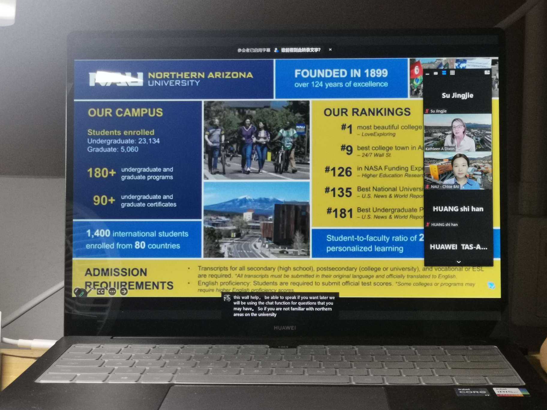 11月8日和10日,yl9193永利集团在线上举行美国文化讲座之“我的美方大学第一课”活动。此次讲座,美国北亚利桑那大学全球招生主任Kathleen Dixon为2023级新生讲授第一课,带大家认识北亚利桑那大学校园环境、文化生活和弗兰克商学院专业情况。北亚利桑那大学/永利集团121双学位项目毕业生向欣竹讲述了121项目学习经历,并分享自己如何通过努力成功申研并就读于美国哥伦比亚大学的经验,鼓励同学们充分利用好校园资源,做好个人规划。中国区代表Chloe Bai进一步介绍北亚学习特点和优秀毕业生去向等,帮助同学们了解项目优势。