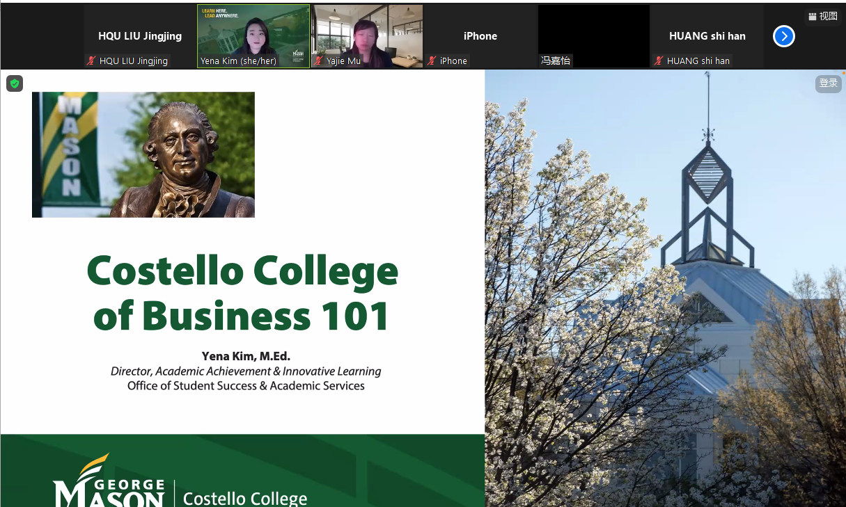 美国乔治梅森大学121项目协调员Yajie Mu介绍了乔治梅森大学地理位置、校园资源和文化活动等,并通过视频分享,让同学们深入了解梅森的校园文化、学习和生活特点。商学院选课指导主任Yena Kim带大家了解商学院、专业特点以及未来就业优势等,帮助同学们进一步了解自己的专业发展情况。