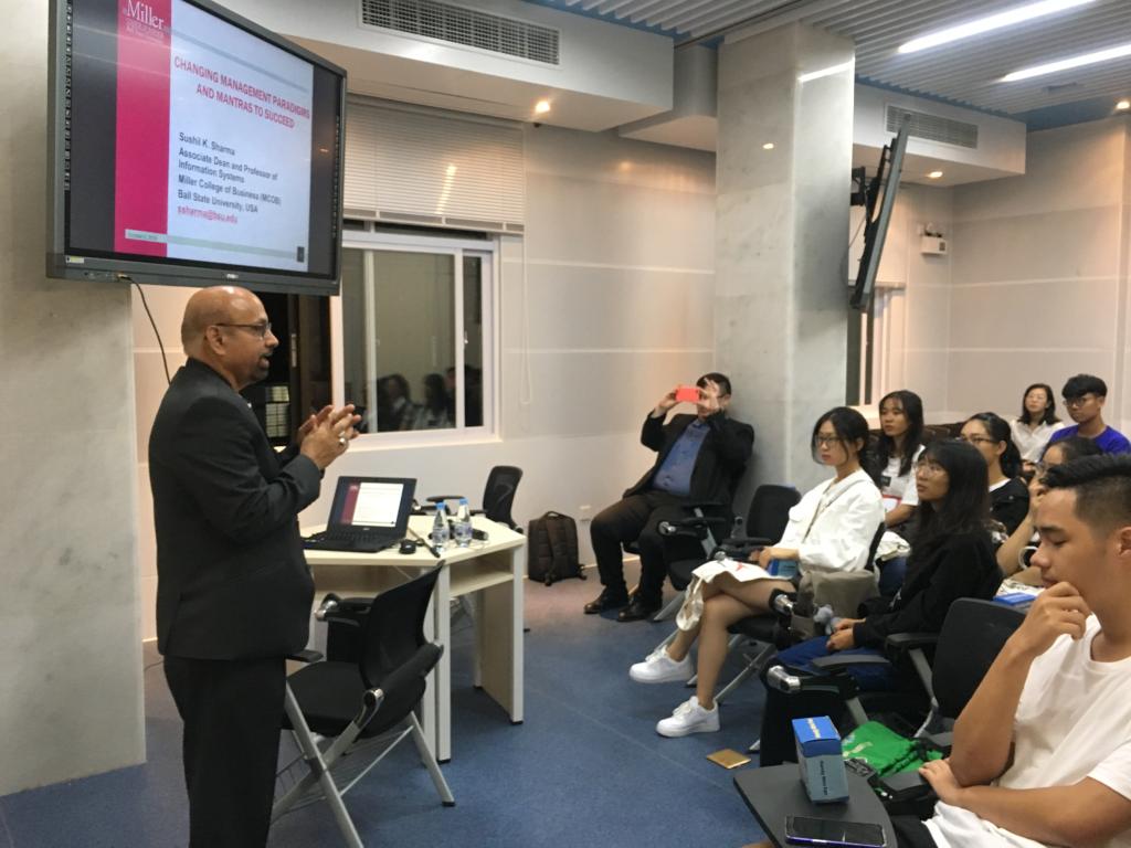 10月8日至10月9日,yl9193永利集团“美国文化周”之“我的美方大学第一课”系列活动顺利落下帷幕。此次,美国鲍尔州立大学(BSU)米勒商学院副院长Dr.Sushil Sharma为我院2018级工商会计双学位班带来《changing management paradigms and mantras succeed》主题班课。 Dr.Sushil 曾在澳洲、加拿大等十五个国家访学,他先用生动的例子为同学们解释了当今全球金融环境下产生的新的专业名词,再结合自己的经历为同学们分享了他觉得作为一个学生应该有的五项品质。