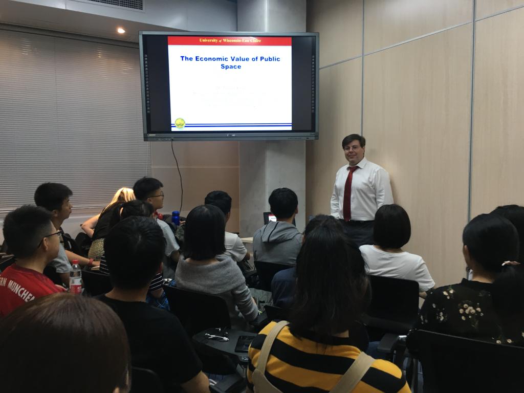 美国威斯康星大学欧克莱尔分校(UWEC)经济系系主任Dr. Thomas Kemp 为2018级国贸金融的同学们讲授了《The Economic Value of Public Space》主题班课。Dr. Kemp 用实际生活中的场景为同学们引述到经济学里的概念,再介绍在UWEC指导同学们做的科学研究如何实际帮助部分地区解决问题。Dr. Kemp还鼓励学生在本科期间多参加科学研究,将理论知识应用到实践中。