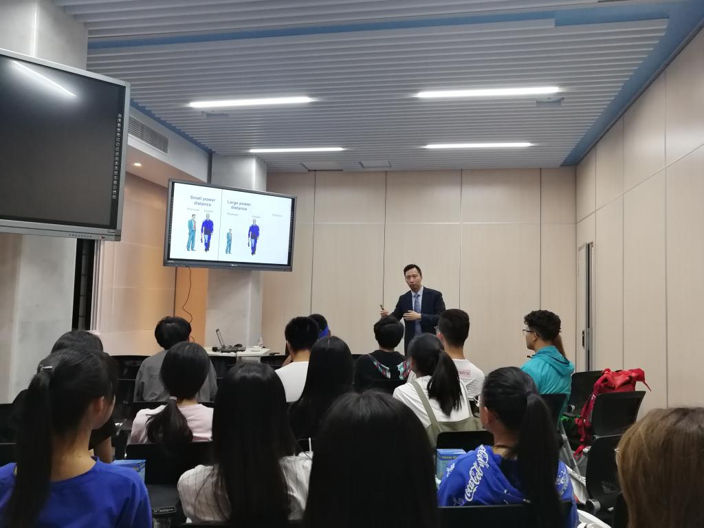 美国北亚利桑那大学(NAU)国际教育中心亚洲项目主管王峰老师为2018级酒店管理全英班带来《Cross-Cultural Communication in the Global Arena》主题班课。王峰老师通过引入霍夫斯泰德文化维度理论为同学们介绍不同文化价值观维度,旨在告诉同学们国际性的跨文化交流在酒店管理中的重要性。再从六个方面向同学们介绍中美文化差异,有利于同学们在今后的赴美交流中有效应对文化冲击。