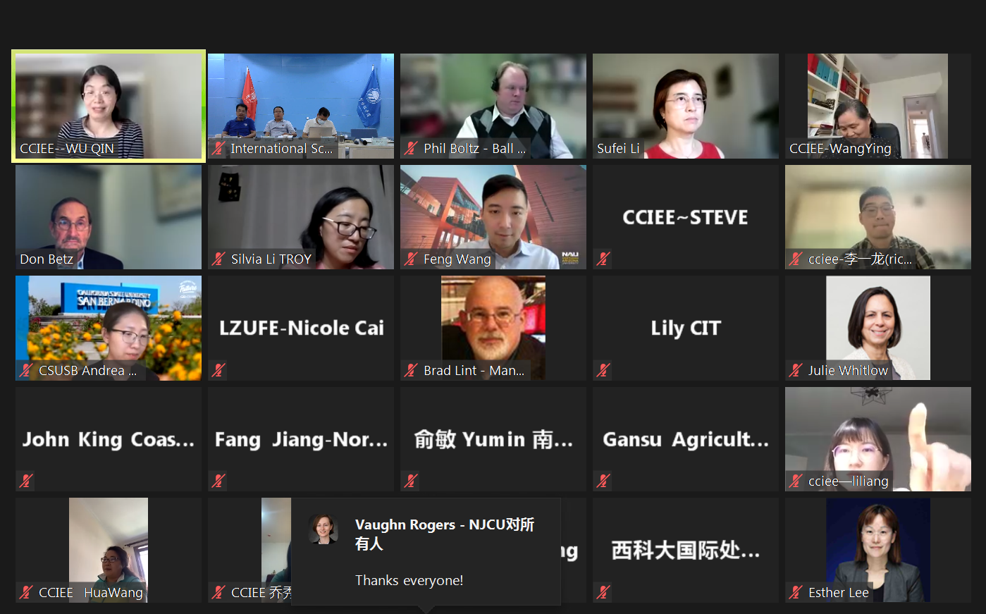 会上,美国州立大学与学院协会国际事务执行主任唐·贝兹和中教国际教育交流中心主任印凯分别致辞,对中美院校长期合作和支持表示感谢,特别是新冠疫情以来,秉承互信互助,共同面对,稳定关系,放眼未来的共识,使《中美人才培养计划》121项目可以在AASCU、CCIEE和中美方大学的共同努力下稳步前进,以传承和发扬为准则,继往开来!希望四方管理的成熟项目机制能发挥决定性的作用,最大力度给学生提供保障。